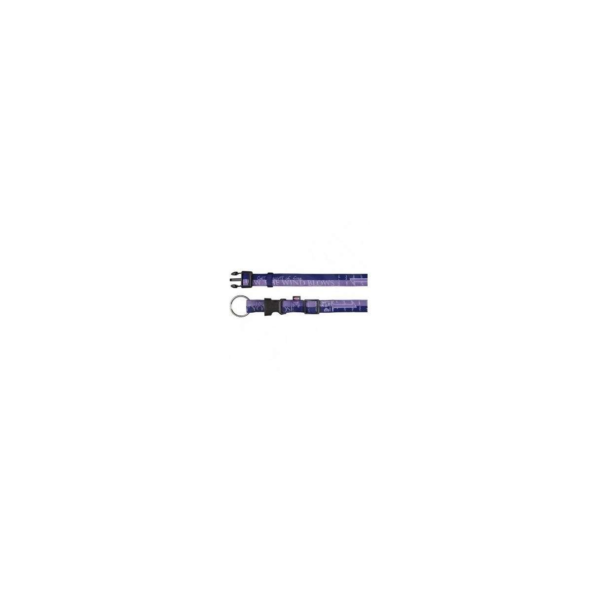 Smuk halsbånd med påsyet motivbånd med lilla farve og tekst, regulerbar i længden og extra blød pga. specielt for, foret er vandafvisende. Blå/lilla nylon.